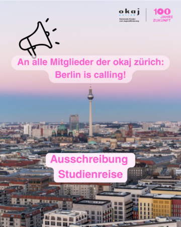 Alle Mitglieder der okaj zürich haben im Jubiläumsjahr die Möglichkeit, sich für eine Studienreise im Frühjahr 2026 nach Berlin zu bewerben. Es dürfen sich jeweils maximal drei Personen pro Team anmelden. Die Platzzahl ist beschränkt. Einsendeschluss ist der Freitag, 24. Oktober 2025, 12 Uhr. Die Bekanntgabe, wer an der Studienreise teilnehmen kann, wird Mitte November per Mail mitgeteilt.