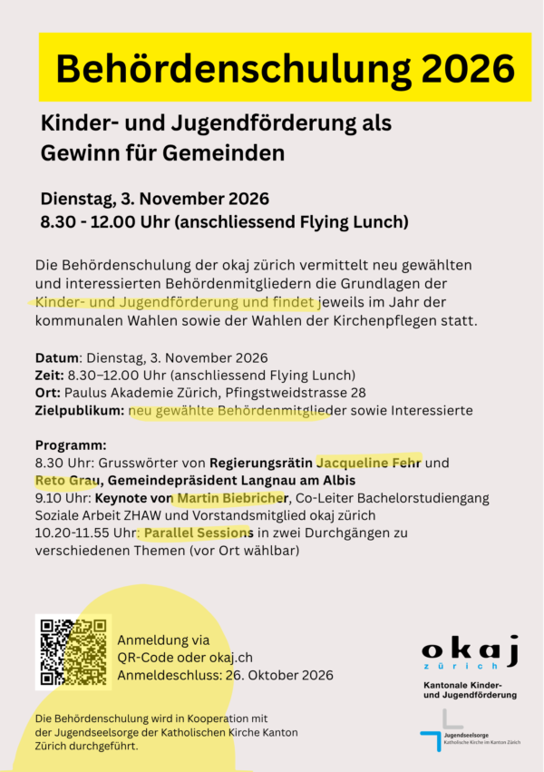 Am Dienstag, 3. November 2026, führt die okaj zürich erneut eine Behördenschulung für neu gewählte kommunale Behördenmitglieder durch. Die Veranstaltung vermittelt Grundlagen der Kinder- und Jugendförderung und findet im Jahr der kommunalen Wahlen bereits zum vierten Mal statt. Sie wird in Kooperation mit der Jugendseelsorge der Katholischen Kirche Kanton Zürich durchgeführt.